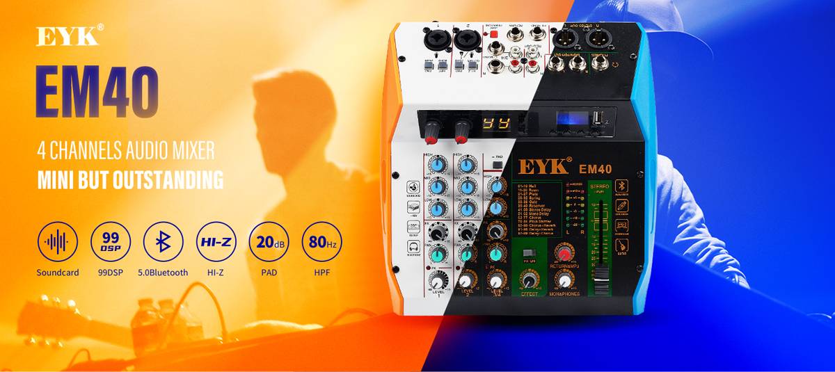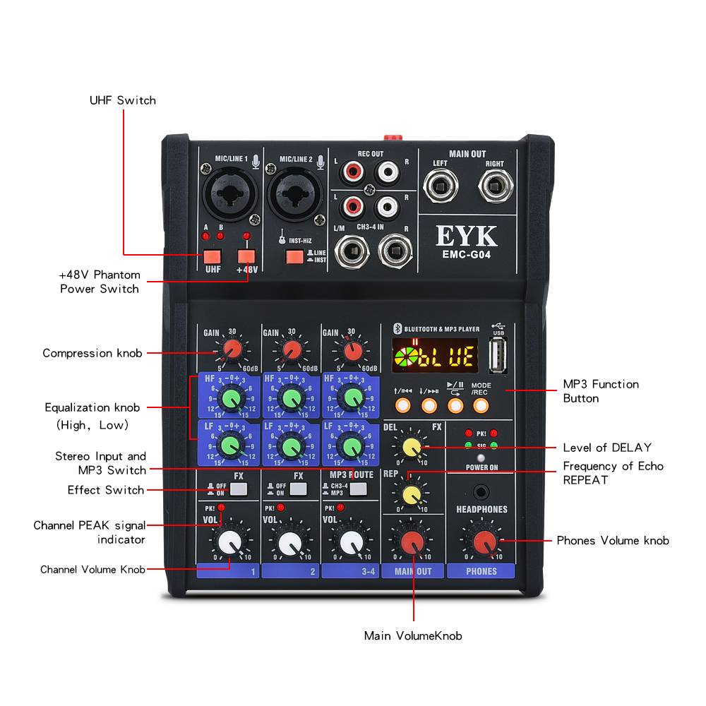 EYK 4 канала мини аудио смеситель для кухни с двумя Беспроводная система микрофона (приемник внутри),Bluetooth USB 48В Мощность