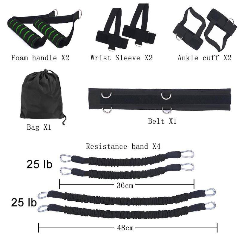 4 шт. x 25LBC диапазон сопротивления2 шт. x манжеты на лодыжке 2 шт. x ремешки на запястье 2 шт. x ручки из пены 1 х поясной ремень 1 х сумка для хранения