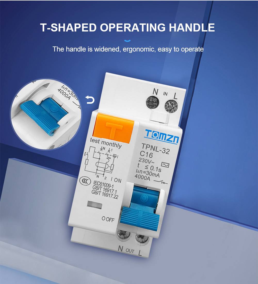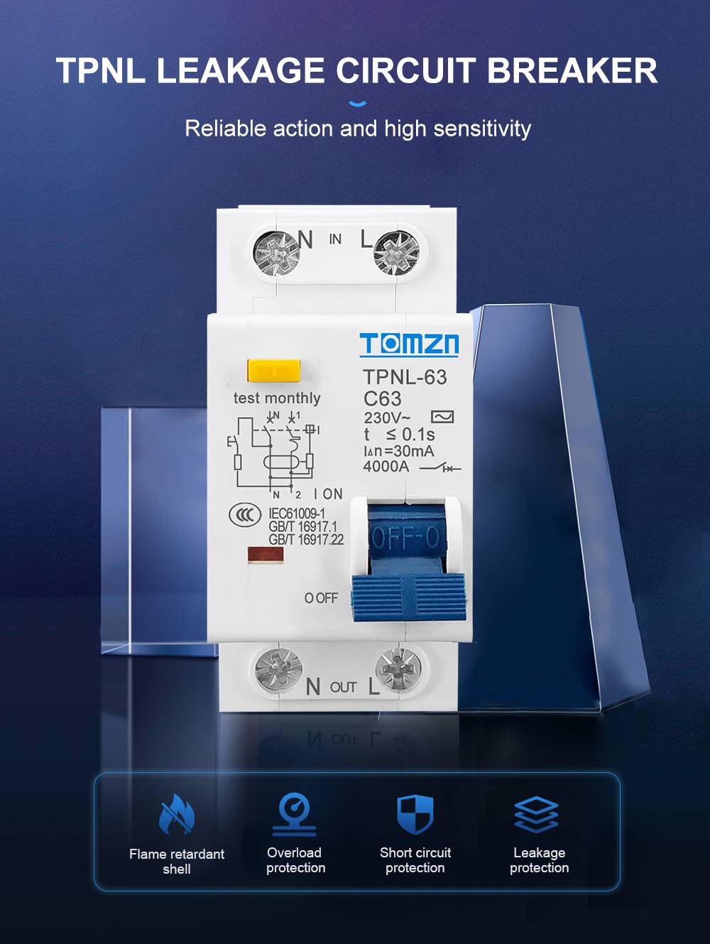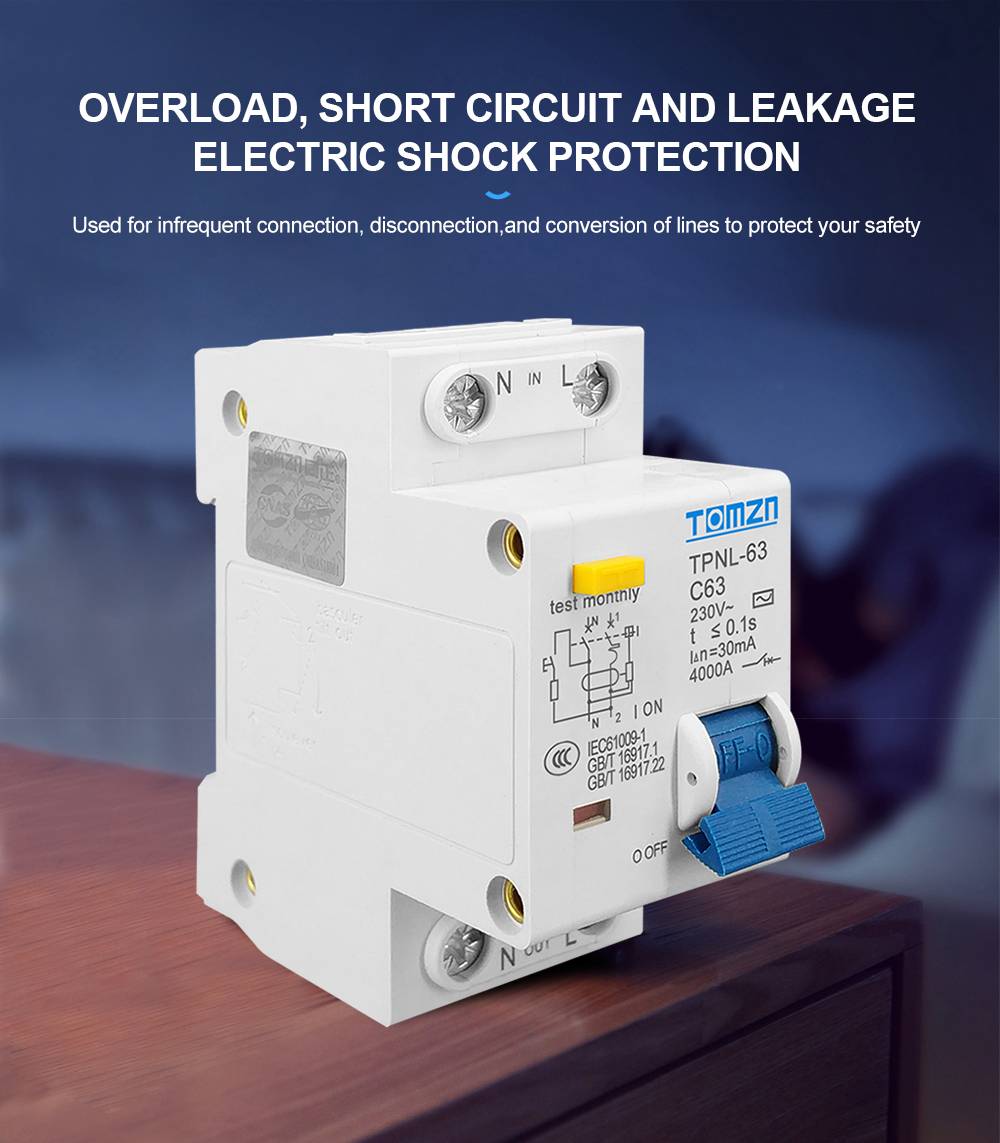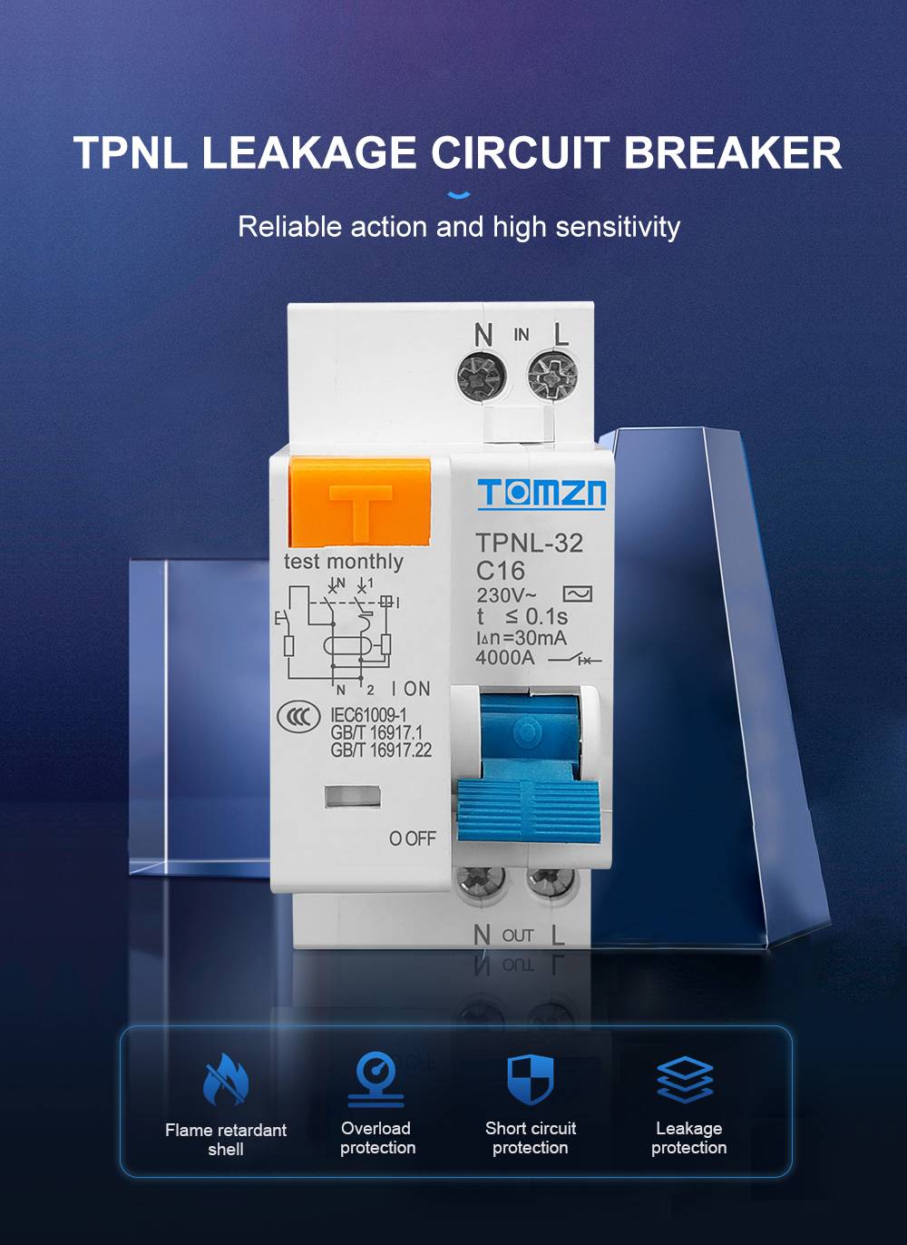 TPNL漏电保护断路器,TPNL漏电保护断路器(相线+中性线+ +过载电压)泄漏保护断路器用于单相住宅电路的交流50 hz / 60 hz,额定电压220 v,用作电子冲击保护。它可以保护公民电子电路过载和短路。本产品具有体积小、分断能力高零,和现场电线把同时都剪掉,也保护个人免受电击时livewire连接相反。