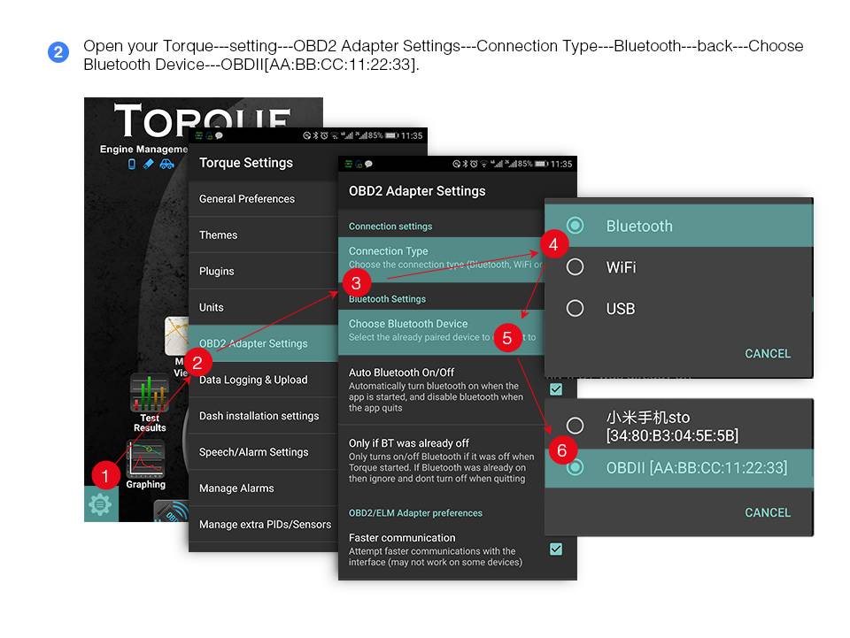 3. Откройте приложение Torque, перейдите в раздел «Настройки», «OBD2 настроек адаптера Тип подключения, Bluetooth, задняя часть, затем выберите